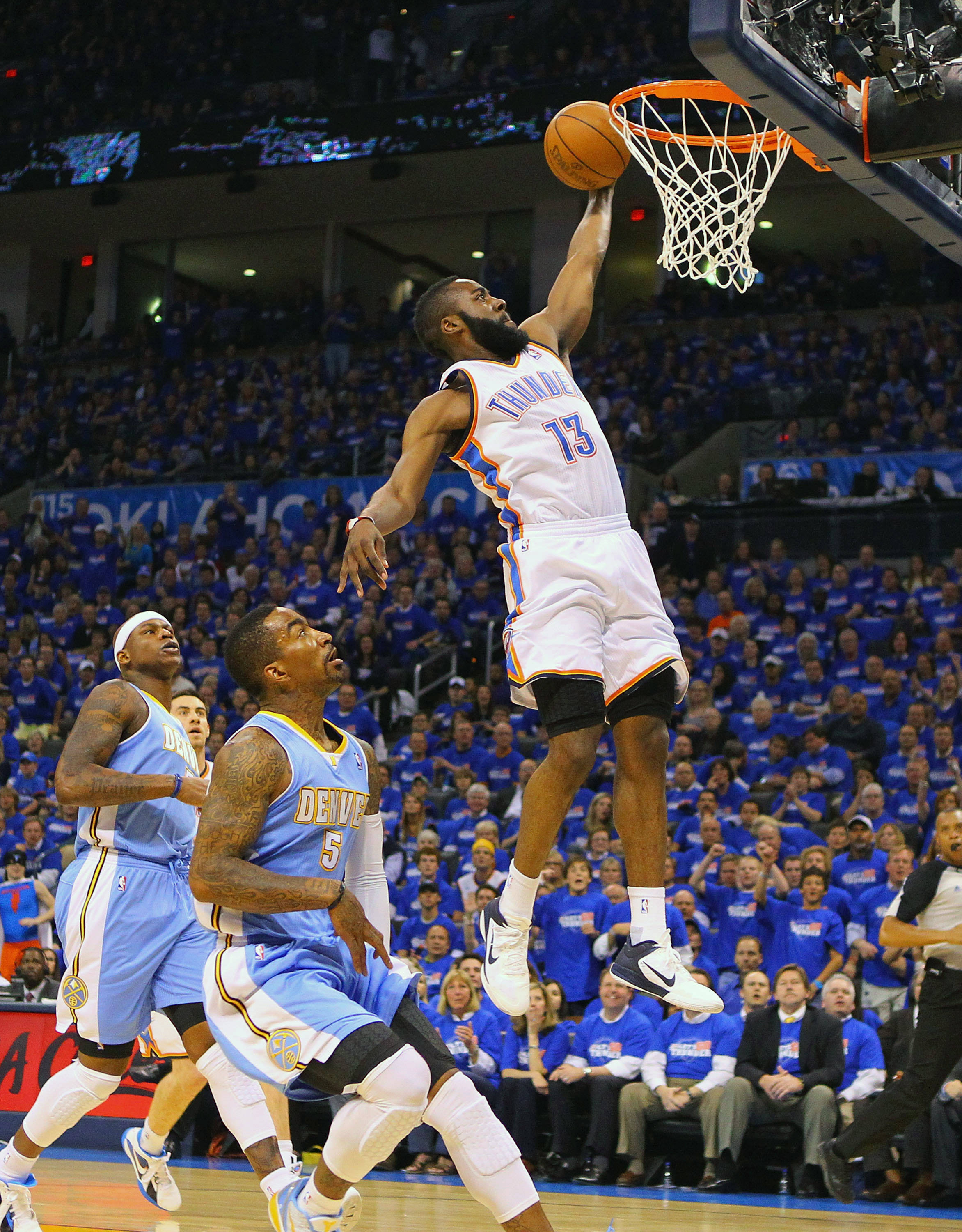 杜兰特场均贡献32.4分,命中率47%,三分命中率43%;威少场均23.8分,命中率仅39%,三分球命中率30%,他的“单打独斗”风格逐渐显现;哈登则贡献了场均10.3分5.6篮板3助攻,命中率38%;伊巴卡场均得到10.2分和11个篮板,并有惊人的5次封盖。