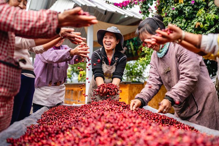 2025年1月8日,在云南省普洱市思茅区天玉咖啡庄园,工作人员庆祝今年咖啡丰收。目前,普洱市咖啡种植面积达67.9万亩,2023到2024年产季咖啡生豆产量5.8万吨,稳居中国咖啡种植面积与产量之首。